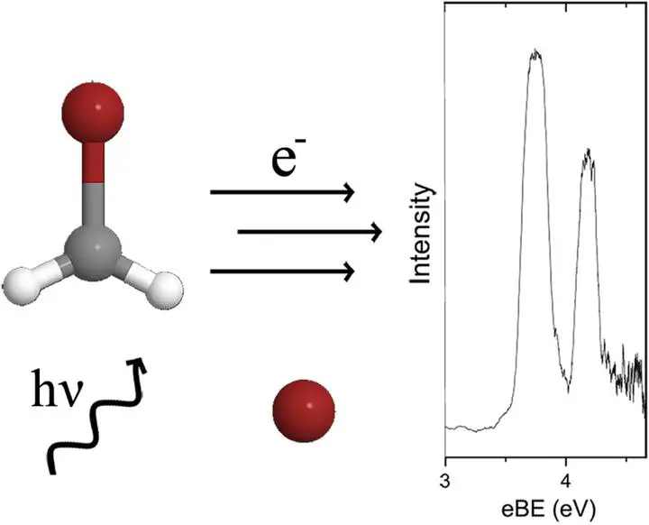 Image credit: Elsevier, Chem. Phys. Lett.The gas phase anion photoelectron spectrum associated with the bromide-bromomethyl radical is presented. The stabilisation energy and electron binding energy, a property corresponding to the electron affinity of the neutral complex, are determined. Ab initio MP2 optimisations (with additional CCSD(T) energies) found two forms of the complex, a hydrogen bonded complex and a halogen bonded complex. The halogen bonded complex was found to exhibit C2v symmetry and the hydrogen bonded complex exhibited Cs symmetry. Comparison between the experimental data and the computational data allow conclusions to be drawn about the structure of the experimentally observed species.