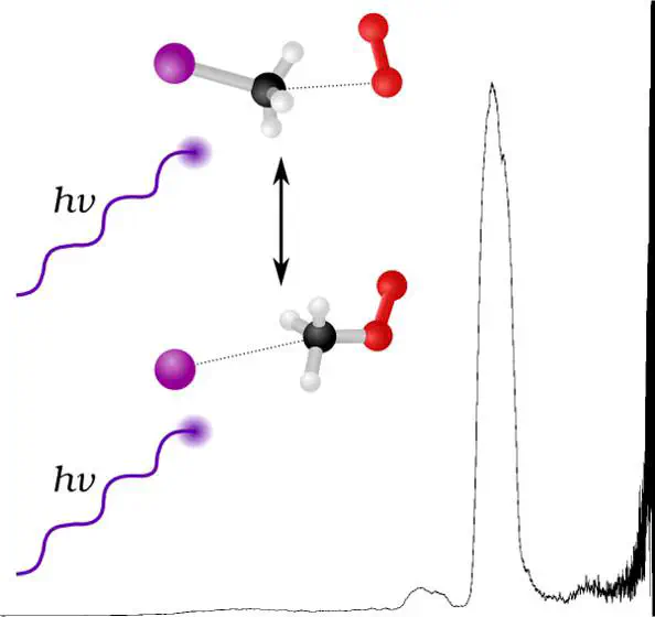 Image credit: ACS, J. Phys. Chem. AAnion photoelectron spectroscopy has been used to investigate the structure and dynamics of CH3OOI– van der Waals complexes. Peaks within the photoelectron spectrum are attributed to photodetachment to the perturbed 2P3/2 state of I$\cdots$CH3OO (3.46 eV) and the two 2P states of bare iodine. A broad feature at 1.7–2.4 eV is attributed to detachment to the excited singlet states from two O2–$\cdots$CH3I complexes. This represents the first anion photoelectron spectroscopy of a halide-bound methylperoxy radical species. Complex structures have been optimized using MP2/aug-cc-pVQZ with single-point energies at W1w theory for ground-state complexes and NEVPT2 for photodetachment to excited O2. Interactions are dominated by electrostatics, with the anion species interacting with the methyl pocket of the solvating molecule, suggesting conversion via an SN2 mechanism, and excess energy leading to complex dissociation within the timescale of mass spectrometry. The calculated W1w Gibbs energies suggest that while an electron transfer (ET) pathway to conversion is available, it is comparatively unfavored.