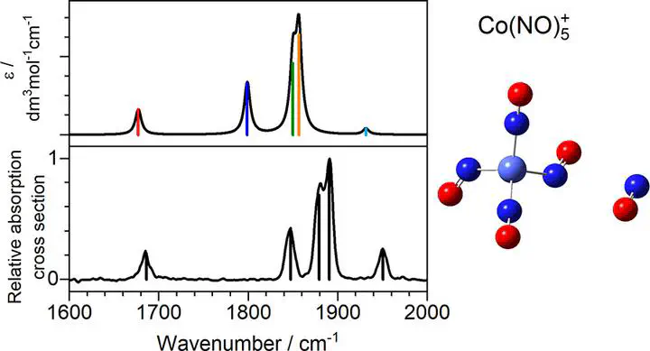 Image credit: ACS, J. Phys. Chem. AWe present a combined experimental and quantum chemical study of gas-phase group 9 metal nitrosyl complexes, M(NO)n+ (M = Co, Rh, Ir). Experimental infrared photodissociation spectra of mass-selected ion-molecule complexes are presented in the region 1600 cm–1 to 2000 cm–1 which includes the NO stretch. These are interpreted by comparison with the simulated spectra of energetically low-lying structures calculated using density functional theory. A mix of linear and nonlinear ligand binding is observed, often within the same complex, and clear evidence of coordination shell closing is observed at n = 4 for Co(NO)n+ and Ir(NO)n+. Calculations of Rh(NO)n+ complexes suggest additional low-lying five-coordinate structures. In all cases, once a second coordination shell is occupied, new spectral features appear which are assigned to (NO)2 dimer moieties. Further evidence of such motifs comes from differences in the spectra recorded in the dissociation channels corresponding to single and double ligand loss.