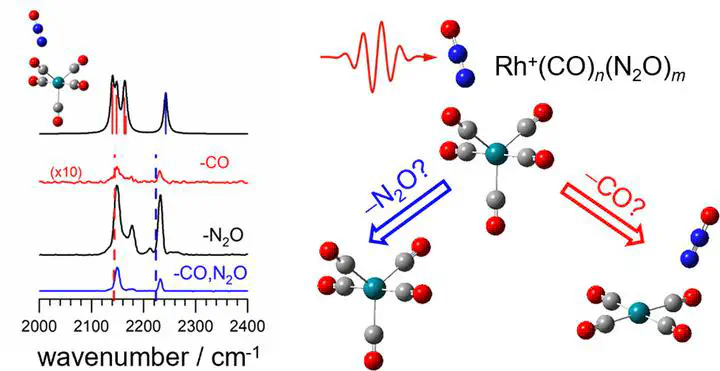 Image credit: ACS, J. Phys. Chem. AIn this study, mixed carbonyl and nitrous oxide complexes with Rh+ were studied by mass-selective infrared photodissociation spectroscopy in a molecular beam. The infrared spectra, recorded in the region of the CO and N2O N═N stretches, were assigned and interpreted with the aid of simulated spectra of low-energy structural isomers. Clear evidence of an inner coordination shell of four ligands is observed. The observed vibrational structure can be understood on the basis of local mode vibrations in the two ligands. However, there is also evidence of multiple low-lying isomers and cooperative binding effects between the two ligands. In particular, σ donation from directly coordinated nitrous oxide ligands drives more classical carbonyl bonding than has been observed in pure carbonyl complexes. The observed fragmentation branching ratios following resonant infrared absorption are explained by simple statistical and energetic arguments, providing a contrast with those of equivalent Au+ complexes.