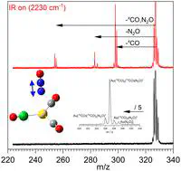 Image credit: RSC, Phys. Chem. Chem. Phys.Isolated mixed-ligand complexes provide tractable model systems in which to study competitive and cooperative binding effects as well as controlled energy flow. Here, we report spectroscopic and isotopologue-selective infrared photofragmentation dynamics of mixed gas-phase Au(12/13CO)n(N2O)m+ complexes. The rich infrared action spectra, which are reproduced well using simulations of calculated lowest energy structures, clarify previous ambiguities in the assignment of vibrational bands, especially accidental coincidence of CO and N2O bands. The fragmentation dynamics exhibit the same unexpected behaviour as reported previously in which, once CO loss channels are energetically accessible, these dominate the fragmentation branching ratios, despite the much lower binding energy of N2O. We have investigated the dynamics computationally by considering anharmonic couplings between a relevant subset of normal modes involving both ligand stretch and intermolecular modes. Discrepancies between correlated and uncorrelated model fit to the ab initio potential energy curves are quantified using a Boltzmann sampled root mean squared deviation providing insight into efficiency of vibrational energy transfer between high frequency ligand stretches and the softer intermolecular modes which break during fragmentation.