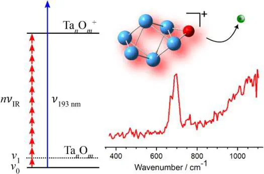 Image credit: Mol. Phys.Resonant and non-resonant multiple photon excitation of small tantalum and tantalum oxide clusters, TanOm (n = 4–15, m = 0, 1, 2) is shown to lead to thermionic emission and the production of the corresponding cationic clusters. In this way, we have recorded mass-resolved photoionisation spectra in the mid-infrared using the intense free-electron laser for intracavity experiments (FELICE). All spectra exhibit a broad non-resonant band with lower thresholds around 800 cm−1 whose efficiency increases to higher wavenumbers as fewer photons are required to reach the ionisation threshold. In addition, the neutral oxide clusters have strong resonant absorptions feature assigned as the oxide symmetric stretching mode, and their infrared spectra are very similar to those reported previously for the corresponding cationic clusters, TanOm+, recorded by infrared multiple photon dissociation.